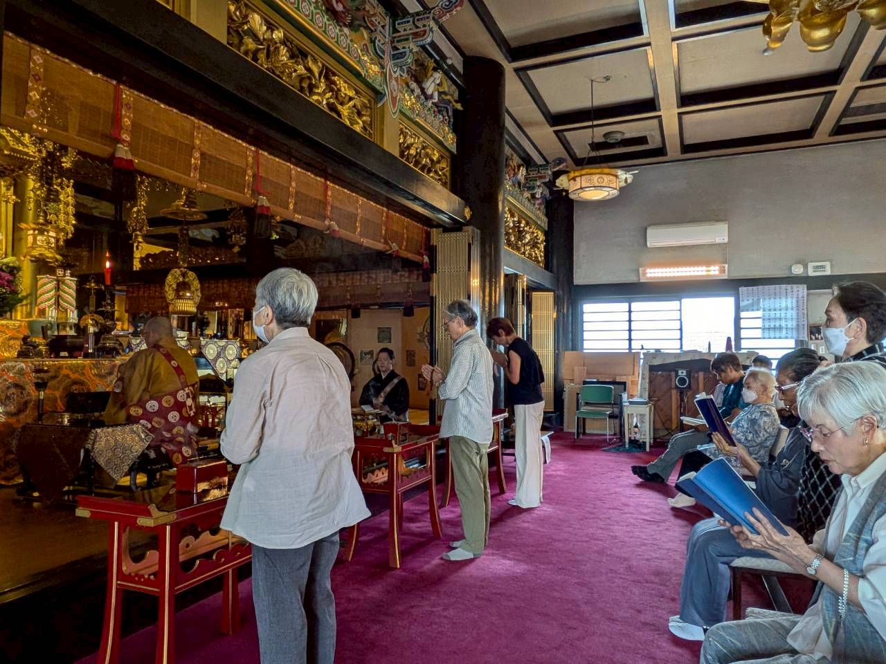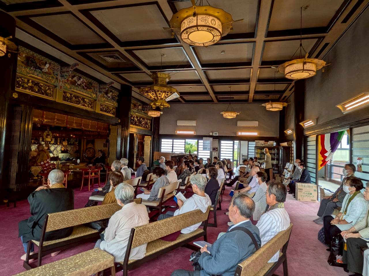本堂で行うお勤めでも月命日やご法事などは仏さまの正面に座ることはなく、内陣の中の脇の席に座り、仏さまにも檀家さまにも横を向いた状態になります。